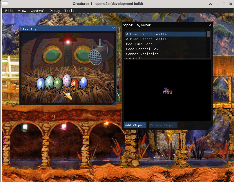 Aborted (core dumped)I recognize those "I'm Here:" lines as dbg: outs from some stuff I was working on. But it looks like openc2e really doesn't like parsing SORC, used in my CAOS function setup, which is... fair, I don't think that command was used in Vanilla C3DS at all, and possibly very rarely in 3rd party stuff.
